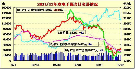 6月27日撮合市場全線低開,盤中弱勢震蕩,終盤收跌。遠(yuǎn)月MA1212合同下跌128元為當(dāng)日跌幅最大合同,MA1207下跌45元,為當(dāng)日跌幅最小合同,其他合同跌幅均未超過百元。交易總成交12820噸,較上一日減少540噸,訂貨量增加2080噸,累計訂貨124120噸?;久嫔希瑲W債危機(jī)影響再被市場放大,西班牙主權(quán)或再遭調(diào)降,德國評級亦被下調(diào),整個歐洲市場的疲態(tài)在很大程度上影響了紡織品的消費。從國內(nèi)原料現(xiàn)貨市場看,目前棉花市場詢價雖有所增多,但鮮有成交;相關(guān)滌綸產(chǎn)品的價格下降趨勢并未完全止住。