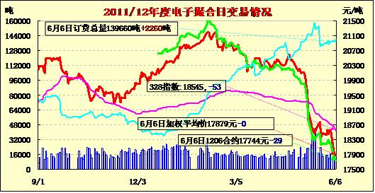 6月6日撮合縮量增倉,跌幅進一步縮小。隔夜,紐約棉花期貨因美國最大棉區(qū)德州出現(xiàn)利好降雨而大幅收跌。近期7月合約結(jié)算價66.89美分/磅,跌164點,主力12月合約65.36美分,跌170點。近四周以來,12月合約累計跌幅達到20美分以上。撮合市場早盤低開,延續(xù)窄幅下行態(tài)勢,終盤報跌。交易總成交14840噸,較上一日減少320噸,訂貨量增加2260噸,累計訂貨139660噸。 基本面上,本周全球多家央行將先后召開議息會議,應(yīng)對日益暗淡的經(jīng)濟前景,預(yù)計各會議結(jié)果將對期市走勢產(chǎn)生重要影響,宏觀面能否出現(xiàn)積極變化將是本周市場走勢的關(guān)鍵。