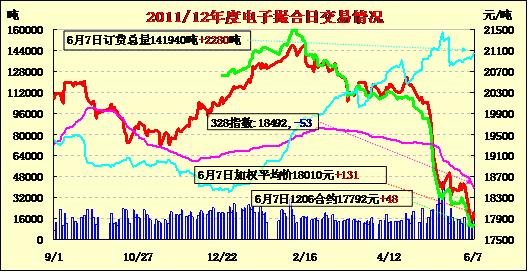 6月7日撮合交易縮量增倉,大幅反彈。受外部市場(chǎng)整體上漲帶動(dòng),周三紐約期棉大幅收漲,近期7月和主力12月合約均封于漲停,結(jié)算價(jià)分別為69.89和68.36美分/磅,其他各合約漲幅均在200點(diǎn)以上。受此提振,撮合市場(chǎng)早盤高開高走,終盤大幅收漲。交易總成交14560噸,較上一日減少280噸,訂貨量增加2280噸,累計(jì)訂貨141940噸?;久嫔希瑖?guó)際宏觀市場(chǎng)風(fēng)吹草動(dòng)的消息時(shí)時(shí)牽動(dòng)投資者的心,雖然當(dāng)前部分國(guó)家的領(lǐng)導(dǎo)紛紛表示出未來寬松政策的導(dǎo)向,但分析人士稱,由于歐債危機(jī)的反復(fù)不定,市場(chǎng)寄予厚望的QE3未必會(huì)在6月底推出,一旦QE3落空,那短期內(nèi)商品市場(chǎng)將繼續(xù)承壓。