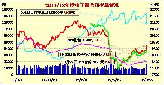 8月22日撮合市場縮量增倉,均價續(xù)漲三連陽。隔夜美元走低、外部谷物市場強勁上揚,同時印度旱情繼續(xù)對市場形成支持,促紐約期棉再次大幅走高,近期10月合約收于76.45美分/磅,漲228點;主力12月合約結(jié)算價77.30美分/磅,漲247點。市場成交量大幅增加,為兩個月以來最高值。今日撮合市場各合同高開,日內(nèi)窄幅整理,終盤收高。撮合交易總成交13940噸,較上一日減11460噸,訂貨量增200噸,累計訂貨122880噸?;久嫔?,目前北半球出現(xiàn)極端天氣,美國大旱及印度季風(fēng)遲遲未到造成水量短缺,若未來極端天氣持續(xù)下去的話,勢必對全球供求格局產(chǎn)量較大的影響。另一方面,國內(nèi)拋儲和收儲的情況受到了各方密切的關(guān)注,因中國棉花庫存量很大,其未來拋儲情況,勢必對全球市場供求有所影響。當(dāng)前棉花現(xiàn)貨價格有上漲趨勢,下游棉紗市場有提價意向,服裝出口也緩慢回升,但未來美國及歐洲經(jīng)濟情況仍是決定未來下游需求的關(guān)鍵。