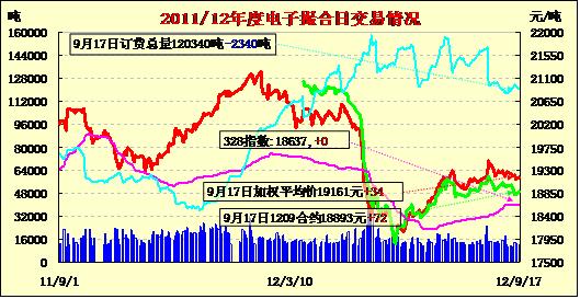 9月17日撮合市場(chǎng)倉(cāng)量減少,均價(jià)全面上漲。除MA1210平開(kāi)外,其他各合同均高開(kāi),日內(nèi)震蕩走高,終盤(pán)收高。當(dāng)日MA1211合同漲101元/噸,漲幅最大。其他各合同漲56—86元/噸不等。交易總成交11780噸,較上交易日減840噸,訂貨量減2340噸,累計(jì)訂貨120340噸?;久嫔?,收儲(chǔ)啟動(dòng)后,13日首次出現(xiàn)成交,成交量為1400噸。之后14日成交1520噸。目前新棉上市量逐步加大,按市場(chǎng)情況,上市的滿足收儲(chǔ)規(guī)格的棉花將流入國(guó)儲(chǔ),隨著交儲(chǔ)活動(dòng)氣氛變得活躍,收儲(chǔ)托市的政策將主導(dǎo)市場(chǎng)。近期,港口棉花通關(guān)速度加快,成交的儲(chǔ)備棉出庫(kù)也加快,市場(chǎng)上可用棉量加大,下游需求仍疲軟,這將使現(xiàn)貨市場(chǎng)成交氛圍繼續(xù)清淡。