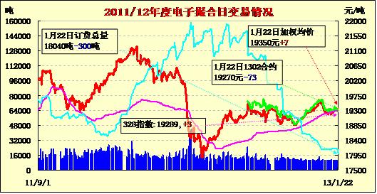 1月22日撮合各合同開盤高低不一,日內(nèi)震蕩下行,終盤下跌。當(dāng)日除MA1307合同外,其他合同價(jià)格均跌19—73元/噸。其中MA1302價(jià)格下跌最多,跌73元/噸。交易成交10200噸,較上一交易減500噸。MA1301已交割,除去MA1301交割量,訂貨量減少300噸,累計(jì)訂貨18040噸。臨近2月,國家是否會按照過去兩年的時(shí)間表,繼續(xù)推出新年度臨時(shí)收儲政策?如果推出,收儲價(jià)會定在哪里?上述問題已成為當(dāng)前市場各方關(guān)注的焦點(diǎn)。