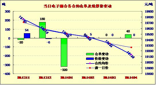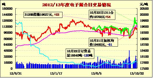 10月22日商品棉交易多數(shù)合同高開,全天走勢相對平穩(wěn),均價(jià)漲跌不一。MA1311平均價(jià)19760漲54,MA1312均價(jià)19576跌6,MA1401均價(jià)19505跌2,MA1402平均價(jià)19446漲5,MA1403均價(jià)19334不變,MA1404首日均價(jià)19136。交易成交25280噸,較上一交易日減5520噸。MA1401和MA1402分別成交10400噸和10700噸,為主要成交合同。訂貨量減少120噸,累計(jì)訂貨16640噸。MA1311和MA1401訂貨量分別減少20噸和320噸,MA1312和MA1404訂貨量分別增加180噸和40噸,其余合同訂貨量不變。
