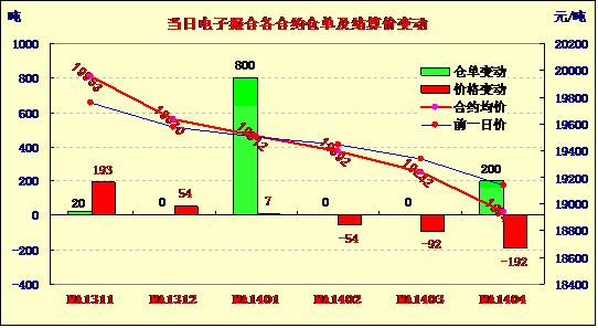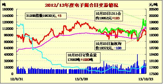 10月23日商品棉交易各合同開(kāi)盤(pán)高低不一,寬幅震蕩,均價(jià)近漲遠(yuǎn)跌。MA1311平均價(jià)19953漲193,MA1312均價(jià)19630漲54,MA1401均價(jià)19515漲7,MA1402平均價(jià)19392跌54,MA1403均價(jià)19242跌92,MA1404均價(jià)18944跌192。交易成交21400噸,較上一交易日減3880噸。MA1312和MA1404成交放量,分別成交4640噸和5000噸。訂貨量增加1020噸,累計(jì)訂貨17660噸。MA1311、MA1401和MA1404訂貨量分別增加20噸、800噸和200噸,其余合同訂貨量不變。