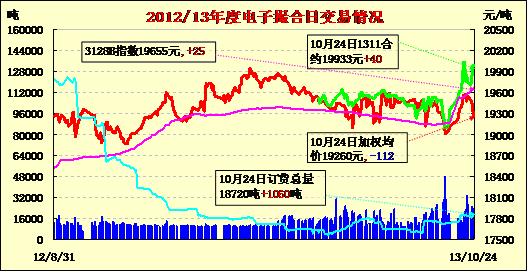 10月24日商品棉交易各合同開低開,寬幅震蕩,均價近漲遠跌。MA1311平均價19993漲40,MA1312均價19631漲1,MA1401均價19507跌5,MA1402平均價19351跌41,MA1403均價19154跌88,MA1404均價18812跌132。交易成交23780噸,較上一交易日增2380噸。訂貨量增加1060噸,累計訂貨18720噸。