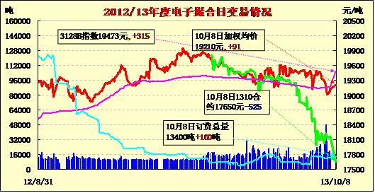 10月8日,商品棉交易各合同開盤高低不一,寬幅震蕩,均價漲跌不一。MA1310平均價17650跌525,MA1311平均價19500漲150,MA1312均價19289漲113,MA1401均價19239漲85,MA1402平均價19178漲74,MA1403均價18945不變。交易成交15940噸,較上一交易日增2640噸。MA1312、MA1401和MA1402分別成交3540噸、3540噸和8700噸,其余合同基本無成交。訂貨量增加160噸,累計訂貨13400噸。MA1311、MA1312和MA1401訂貨連量均增加20噸,其余合同訂貨量不變。