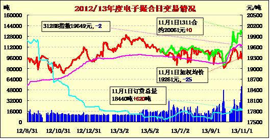 11月1日商品棉交易各合同開盤高低不一,窄幅震蕩,均價漲跌互現(xiàn)。MA1311平均價20061持平,MA1312均價19771跌10,MA1401均價19572跌7,MA1402平均價19222跌71,MA1403均價19090漲8,MA1404均價19000持平。交易成交29320噸,較上一交易日減23400噸。當日MA1402和MA1403成交大幅縮減,分別較昨日成交大減15660噸和5740噸,其他合同亦分別較昨日減少20-1180噸不等。訂貨量增加620噸,累計訂貨18440噸。