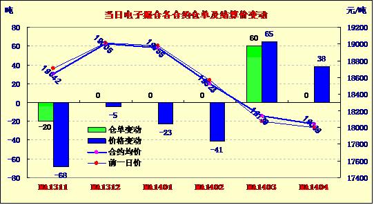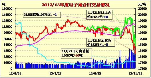 11月21日,商品棉交易各合同開(kāi)盤(pán)高地不一,終盤(pán)近跌遠(yuǎn)漲。MA1311平均價(jià)18642跌68,MA1312均價(jià)19005跌5,MA1401均價(jià)18955跌23,MA1402平均價(jià)18523跌41,MA1403均價(jià)18139漲65,MA1404均價(jià)18038漲38。交易成交27500噸,較上一交易日減12220噸。訂貨量增加40噸,累計(jì)訂貨18060噸。