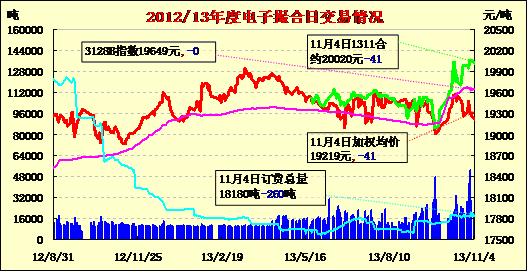 11月4日,商品棉交易各合同開盤高低不一,日內寬幅震蕩,均價下跌。MA1311平均價20020跌41,MA1312均價19771不變,MA1401均價19567跌5,MA1402平均價19215跌7,MA1403均價18979跌111,MA1404均價19000持平。交易成交20380噸,較上一交易日減8940噸。訂貨量減少260噸,累計訂貨18180噸。