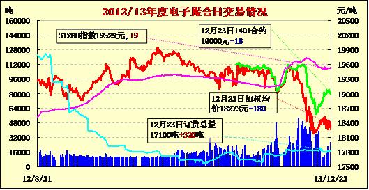 12月23日,商品棉交易各合同開盤高低不一,日內(nèi)走勢相對平穩(wěn),均價漲跌互現(xiàn)。MA1401均價19000跌16,MA1402平均價18386漲91,MA1403均價18228不變,MA1404均價18131跌42,MA1405均價18100跌125,MA1406首日均價18225。交易成交26300噸,較上一交易日增14620噸。MA1312已了結(jié)下市,今日各上市合同訂貨總量增加320噸,累計訂貨17100噸。