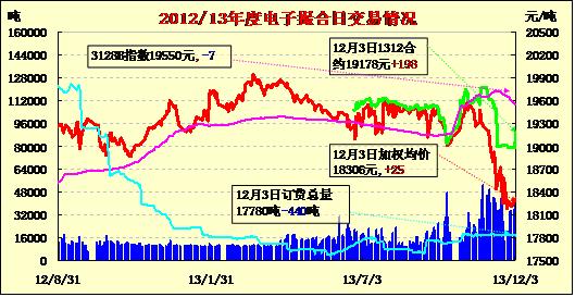 12月3日,商品棉交易各合同開盤高低不一,寬幅震蕩,終盤近漲遠(yuǎn)跌。MA1312均價19178漲198,MA1401均價18711漲93,MA1402平均價18451漲50,MA1403均價18333跌15,MA1404均價18150跌31,MA1405均價18130跌28。交易成交38980噸,較上一交易日增加2980噸。訂貨量減440噸,累計訂貨17780噸。