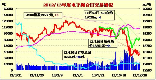 12月30日,商品棉交易合同開(kāi)盤高低不一,走勢(shì)平穩(wěn),均價(jià)變化不大。MA1401均價(jià)19020跌4,MA1402平均價(jià)18319漲5,MA1403均價(jià)18231漲2,MA1404均價(jià)18240不變,MA1405均價(jià)18300不變,MA1406均價(jià)18225不變。交易成交19520噸,較上一交易日減4280噸。訂貨總量減40噸,累計(jì)訂貨16320噸。