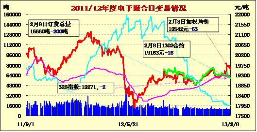 2月8日撮合大部分合同以上一日均價附近開盤,日內(nèi)窄幅震蕩,遠(yuǎn)月合同震幅略大,終盤收跌。當(dāng)日MA1306和MA1307合同均下跌81元/噸,為當(dāng)日跌幅最大合同;其他合同均出現(xiàn)不同程度下跌,跌幅在16-63元/噸不等。交易成交11480噸,較上一交易日增加860噸。訂貨量減200噸,累計訂貨16660噸。目前現(xiàn)貨市場已經(jīng)進(jìn)入春節(jié)前的預(yù)備狀態(tài),棉企打掃廠房,張燈結(jié)彩準(zhǔn)備過年,市場基本無成交。