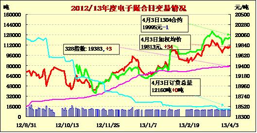 4月3日,商品棉交易各合同基本高開,日內(nèi)窄幅整理,均價多數(shù)上漲。近月MA1304和MA1305均價基本沒有變化,其余合同均價上漲23—32元/噸不等。交易成交10200噸,較上一交易日減少200噸。訂貨量不變,累計訂貨12160噸。新疆將迎來雨雪降溫天氣 部分地區(qū)降幅達15度,此次降溫對春播影響較大。近日儲備棉投放成交不足,一方面企業(yè)是在等待新的政策明確,包括適當加大高等級棉花和進口棉花的投放,以及是否投放2012/13年度新棉;另外,是否允許貿(mào)易商入市也成為大家關(guān)注的關(guān)鍵問題之一。
