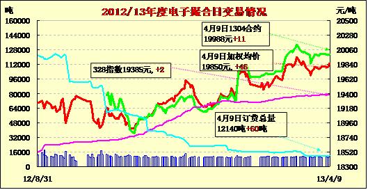 4月9日,商品棉交易各合同高開(kāi),日內(nèi)寬幅震蕩,均價(jià)多數(shù)上漲。MA1305均價(jià)下跌13元/噸,MA1303合約均價(jià)小幅上漲11元/噸,其余合同漲46—84元/噸不等。交易成交10340噸,較上一交易日增160噸。訂貨量增60噸,累計(jì)訂貨12140噸。目前處于春播階段,部分地區(qū)受低溫影響,播種工作推遲,近期氣溫有望回升,新疆南疆播種進(jìn)度相對(duì)較快。據(jù)了解內(nèi)地很多地方由于植棉成本增加,收益不如其他一些作物,農(nóng)民種植積極性不高。港口方面,目前港口成交仍舊清淡,買家接受價(jià)位仍舊低于貿(mào)易商報(bào)價(jià)。