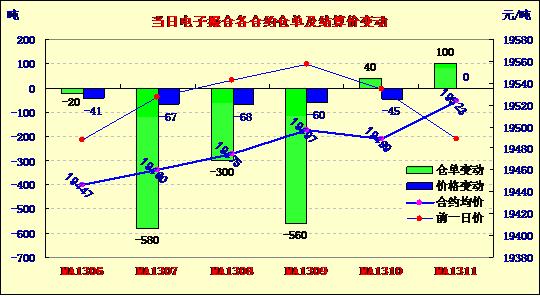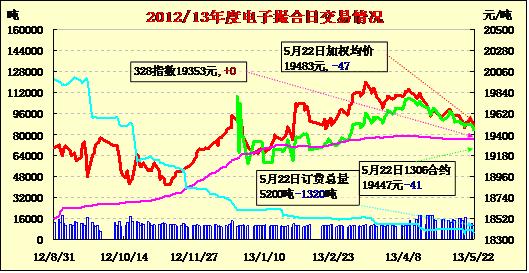 5月22日,商品棉交易各合同開盤高低不一,全天振幅不大,終盤均價下跌。當日撮合各合同均價下跌,跌41—68元/噸。MA1306平均價19447跌41,MA1307平均價19460跌67,MA1308平均價19475跌68。交易總成交10900噸,較上一交易日減少1380噸。MA1305已經下市,新合同MA1311首日成交2060噸。MA1308成交量回落,成交1840噸,其余合同成交1420—2260噸不等。訂貨量減少1320噸,累計訂貨5200噸。MA1306、MA1307、MA1308和MA1309訂貨量分別減持20噸、580噸、300噸和560噸。MA1310訂貨量增持40噸。MA1311首日訂貨100噸。