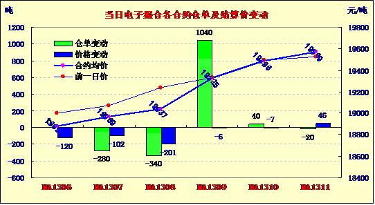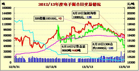 6月18日,商品棉交易各合同開(kāi)盤(pán)高低不一,日內(nèi)波動(dòng)幅度較大,均價(jià)多數(shù)下跌。MA1306平均價(jià)18800跌120,MA1307平均價(jià)18969跌102,MA1308平均價(jià)19037跌201,MA1309平均價(jià)19325跌6,MA1310平均價(jià)19486跌7,MA1311平均價(jià)19569跌46。交易成交25800噸,較上一交易日增3140噸。MA1307和MA1308分別成交4120噸和6940噸,成交量明顯增加。MA1306成交仍舊極為清淡,僅成交100噸。MA1309和MA1310成交5440噸和3280噸,成交量有所回落。MA1311成交5920噸,變化不大。訂貨量增加440噸,累計(jì)訂貨8660噸。當(dāng)日MA1309訂貨量大幅增加1040噸,MA1307和MA1308訂貨量分別減少280噸和340噸。其余訂貨量變化不大。