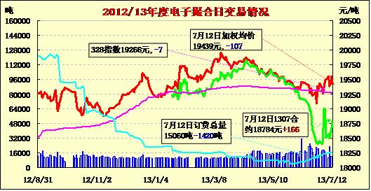 7月12日,商品棉交易各合同開盤高低不一,日內(nèi)寬幅震蕩,均價多數(shù)下跌。MA1307平均價18784漲166,MA1308平均價18915跌66,MA1309平均價19254跌56,MA1310平均價19266跌124,MA1311平均價19531跌24,MA1312均價19527跌24。交易成交11940噸,較上一交易日減少180噸,且主要集中在遠月合同。當日MA1311和MA1312成交6520噸和2660噸,為主要成交合同。訂貨量減少1420噸,累計訂貨量15060噸。MA1307、MA1308、MA1309和MA1310訂貨量分別減少200噸、300噸、900噸和60噸。截至今近月MA1307合同訂貨1980噸。