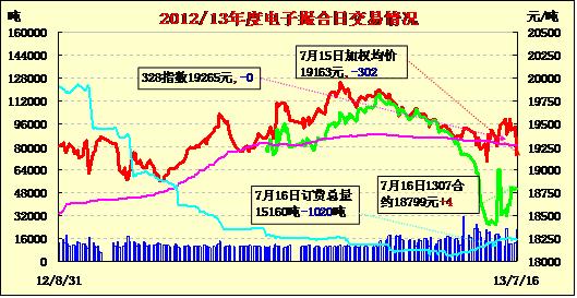 7月16日,商品棉交易各合同開盤高低不一,日內(nèi)弱勢震蕩,均價跌多漲少。MA1307平均價18799漲4,MA1308平均價18900跌182,MA1309平均價19235漲3,MA1310平均價19328跌18,MA1311平均價19517漲5,MA1312均價19517跌31。交易成交22040噸,較上一交易日增加8940噸。近月MA1308合同成交量達到萬噸以上,其外遠月MA1311合同和MA1312合同成交繼續(xù)保持較積極態(tài)勢。其他三份合同成交在820-1580噸不等。訂貨量減少1020噸,累計訂貨量15160噸。MA1307合同和MA1309合同分別減持660噸和940噸,MA1312合同訂貨量微減20噸,MA1310合同和MA1311合同增均增加300噸,MA1312訂貨無變化。