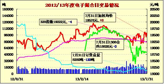 7月31日,商品棉交易合同漲跌不一,近月合約無成交,遠月合同震蕩幅度較大,均價變化不大。MA1308平均價18826不變,MA1309平均價19175不變,MA1310平均價19300不變,MA1311平均價19532跌14,MA1312均價19594漲5,MA1401均價19572漲3。交易成交13140噸,較上一交易日減少280噸。近月幾乎無成交,成交集中在遠月,MA1308和MA1309無成交。MA1310和MA1311成交清淡。MA1312和MA1401為主要成交合同,分別成交7560噸和4520噸。訂貨量減少120噸,累計訂貨量8280噸。MA1312合同訂貨量減少120噸,其余合同訂貨量不變。目前近月MA1308合同訂貨1380噸。訂貨量最大合同為MA1311,也僅訂貨2140噸。