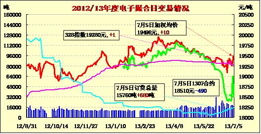 7月5日,商品棉交易合同開盤高低互現(xiàn),日內(nèi)寬幅震蕩,均價漲跌不一。MA1307平均價18510跌490,MA1308平均價19050漲50,MA1309平均價19332漲52,MA1310平均價19338跌46,MA1311平均價19545跌58,MA1312均價19599漲31。交易成交13460噸,較上一交易日減少5840噸。MA1311和MA1312為主要成交合同,分別成交5220噸和5420噸。其余合同成交清淡。訂貨量增加680噸,累計訂貨量15760噸。MA1307、MA1310和MA1311訂貨量分別增持40噸、240噸和400噸。近月合同訂貨2120噸,MA1309和MA1310為主要訂貨合同,分別訂貨4240噸和5340噸。