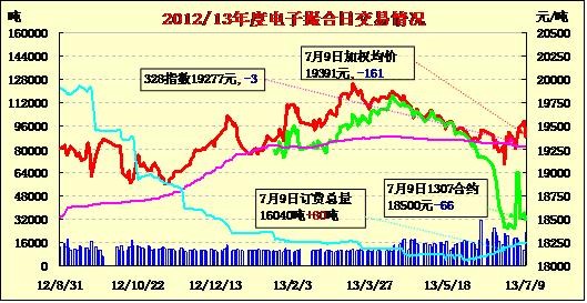 7月9日,商品棉交易近月合同低開,遠(yuǎn)月合同高開,早盤震蕩幅度較大,午后走勢(shì)相對(duì)平穩(wěn),均價(jià)近跌遠(yuǎn)漲。MA1307平均價(jià)18500跌66,MA1308平均價(jià)18673不變,MA1309平均價(jià)19172跌90,MA1310平均價(jià)19369跌12,MA1311平均價(jià)19567漲8,MA1312均價(jià)19631漲11。交易成交22680噸,較上一交易日增11900噸。主要是MA1310合同成交大幅度增加,成交13240噸。近月MA1307和MA1308基本無成交。其余合同成交量也不大,成交2080——3780噸不等。訂貨量增加80噸,累計(jì)訂貨量16040噸。MA1307和MA1310訂貨量分別增持20噸和60噸,其余合同訂貨量不變。目前近月合同訂貨2160噸,MA1309和MA1310為主要訂貨合同,分別訂貨4240噸和5540噸。