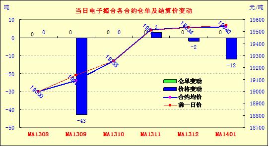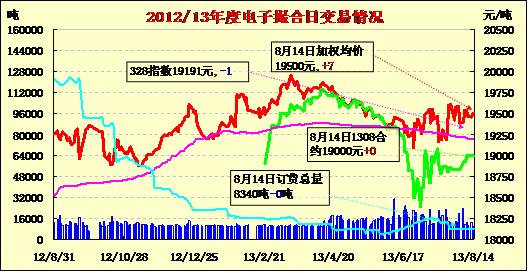 8月14日,商品棉交易開盤高低不一,日內(nèi)窄幅震蕩,均價(jià)漲跌互現(xiàn)。MA1308平均價(jià)19000不變,MA1309平均價(jià)19091跌43,MA1310平均價(jià)19255不變,MA1311平均價(jià)19513漲3,MA1312均價(jià)19534跌2,MA1401均價(jià)19540跌12。交易成交10220噸,較上一交易日增80噸。近月無成交,MA1311和MA1312為主要成交合同。MA1308無成交。MA1311和MA1312分別成交4340噸和37600噸。其余合同成交清淡。訂貨量不變,累計(jì)訂貨量8340噸。 目前近月MA1308訂貨1100噸。MA1311訂貨1880噸,訂貨量最大。