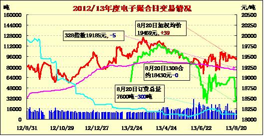 8月20日,商品棉交易開盤高低不一,寬幅震蕩,均價(jià)漲跌互現(xiàn)。MA1308平均價(jià)18430不變,MA1309平均價(jià)18900不變,MA1310平均價(jià)18853跌260,MA1311平均價(jià)19440漲34,MA1312均價(jià)19515漲35,MA1401均價(jià)19530漲31。成交量減少,近月合同仍無成交。交易總成交11340噸,與較上一交易日減少1960噸。MA1311、MA1312和MA1401分別成交2700噸、4900噸和3180噸。近月MA1308和MA1309合同無成交,MA1310僅成交560噸。訂貨量減少,今日MA1401合同訂貨量減少300噸,其余合同訂貨量不變。
