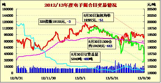 8月30日,商品棉交易各合同開盤高低不一,近期合約大跌。MA1309平均價18438跌443,MA1310平均價18703跌254,MA1311平均價19334跌13,MA1312均價19486漲12,MA1401均價19521漲4,MA1402平均價19451跌43。