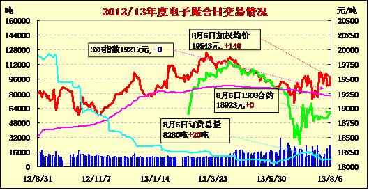 8月6日,商品棉交易各合同開盤高低不一,走勢震蕩幅度不大,均價上漲。MA1308平均價18923 不變,MA1309平均價19184不變,MA1310平均價19254跌54,MA1311平均價19551跌7,MA1312均價19561跌35,MA1401均價19568跌10。交易成交10460噸,較上一交易日減少13180噸。近月成交極為清淡,遠(yuǎn)月為成交主力,MA1312和MA1401分別成交5160噸和4080噸。其余合同成交極為清淡。訂貨量增20噸,累計訂貨量8280噸。MA1311訂貨量減少240噸,MA1401訂貨量增加260噸,其余合同訂貨量不變。目前近月合同僅訂貨1320噸。