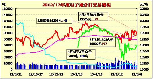 8月8日,商品棉交易各合同開盤高低不一,早盤寬幅震蕩,午后走勢平穩(wěn),均價多數(shù)上漲。MA1308平均價19000漲77,MA1309平均價19180漲75,MA1310平均價19229漲10,MA1311平均價19530跌25,MA1312均價19568漲2,MA1401均價19569不變。交易成交12680噸,較上一交易日增960噸。成交集中在遠月,近月成交清淡。今日遠月合同MA1311和MA1401分別成交6000噸和4480噸,其余合同成交較為清淡。成交集中在遠月,近月成交清淡,遠月合同MA1311和MA1401分別成交6000噸和4480噸,其余合同成交較為清淡。訂貨量減少180噸,累計訂貨量8400噸。MA1308和MA1309訂貨量分別減少160噸和40噸,MA1310訂貨量增加20噸,其余合同訂貨量不變。