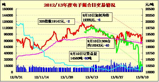 9月10日,商品棉交易各合同開盤高地不一,寬幅震蕩,均價漲跌互現(xiàn)。MA1309平均價18243跌40,MA1310平均價18396跌131,MA1311平均價19482跌48,MA1312均價19531漲17,MA1401均價19527漲4,MA1402平均價19442跌28。交易成交17360噸,較上一交易日增1600噸,交投重心仍遠月。MA1309、MA1310和MA1311交投仍清淡。MA1312、MA1401和MA1402為主要成交合同,分別成交5200噸、3940噸和5700噸。MA1309、MA1310和MA1311交投仍清淡。MA1312、MA1401和MA1402為主要成交合同,分別成交5200噸、3940噸和5700噸。MA1401合同訂貨量減少60噸,其余合同訂貨量不變。目前近月MA1309訂貨量1420噸。