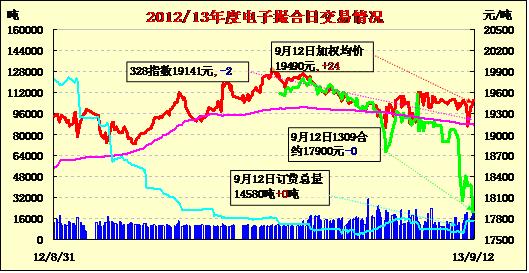 9月12日,商品棉交易多數(shù)合同高開,日內(nèi)寬幅震蕩,近月價格不變,其余合同多數(shù)上漲。MA1309平均價17900不變,MA1310平均價18000不變,MA1311平均價19466漲64,MA1312均價19545漲27,MA1401均價19534漲19,MA1402平均價19392跌1。成交23780噸,較上一交易日增3960噸。MA1309和MA1310今日無成交。MA1312成交7780噸,為主要成交合同。其余合同成交4020-6000噸。訂貨量增不變,累計訂貨14580噸。