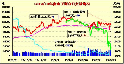 9月16日,商品棉交易各合同開盤高低不一,寬幅震蕩,均價多數(shù)下跌。MA1309平均價17838跌236,MA1310平均價18100跌175,MA1311平均價19537漲10,MA1312均價19517跌14,MA1401均價19500跌25,MA1402平均價19399跌92。交易成交23920噸,較上一交易日增加2340噸,近月成交慘淡,遠月為交投重心。近月MA1309和MA1310分別成交160噸和40噸,成交仍舊慘淡。MA1401成交9120噸,為主要成交合同。其余合同成交4440—5660噸不等。訂貨量增加700噸,累計訂貨14580噸。MA1312和MA1401合同訂貨量增加240噸和480噸,其余合同訂貨量變化不大。目前近月MA1309訂貨量1420噸。