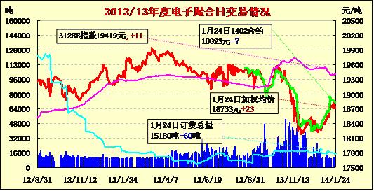 1月24日,商品棉交易有以下特點(diǎn):一、成交清淡。今日MA1403成交5000噸,成交相對活躍。MA1403和MA1406分別成交3200噸和1060噸,其余合同成交不足1000噸,總體成交清淡。二、訂貨量不變。今日MA1406訂貨量減少60噸,其余合同訂貨量不變。目前近月MA1402訂貨2760噸,訂貨主力MA1403訂貨10060噸。三、多數(shù)價格下跌。除MA1405合約漲9元外,其他合約繼續(xù)下跌的。