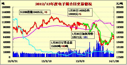 1月26日,商品棉交易合同多數(shù)低開,遠(yuǎn)期大跌。MA1402合同平均價(jià)18828元/噸,MA1403合同平均價(jià)18826元/噸,分別小漲5-3元。MA1404合同平均價(jià)18240元/噸,MA1405合同平均價(jià)18315元/噸,MA1406合同平均價(jià)18435元/噸,MA1407合同平均價(jià)18147元/噸,下跌94-213元不等。交易成交10180噸,較上一交易日減760噸。訂貨量增加80,累計(jì)訂貨15260噸。