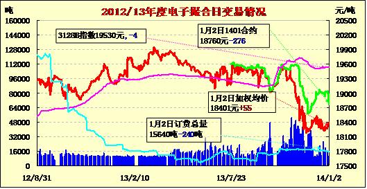 1月2日,商品棉交易各合同開盤高低不一,日內寬幅震蕩,均價漲跌互現(xiàn)。MA1401均價18760跌276,MA1402平均價18448漲54,MA1403均價18358漲64,MA1404均價18600漲360,MA1405均價18500漲150,MA1406均價18225不變。交易成交10280噸,較上一交易日增加260噸。訂貨總量減240噸,累計訂貨15640噸。