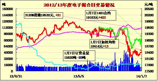 1月7日,商品棉交易各合同開盤高低不一,寬幅震蕩,均價漲跌不一。MA1401均價19163漲403,MA1402平均價18555漲107,MA1403均價18428漲70,MA1404均價18289跌311,MA1405均價18341跌159,MA1406均價18311漲86。交易成交10420噸。訂貨總量15620噸。