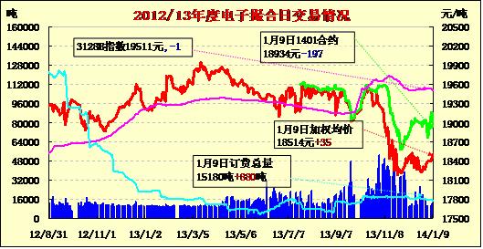 1月9日,商品棉交易多數(shù)合同高開,寬幅震蕩,均價多數(shù)上漲。MA1401均價18934跌197,MA1402平均價18648漲69,MA1403均價18472漲31,MA1404均價18511漲140,MA1405均價18389漲66,MA1406均價18458漲181。交易成交12600噸,較上一交易日增520噸。訂貨量增880噸,累計訂貨15180噸。