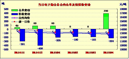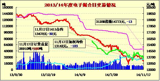 11月17日全國(guó)棉花交易市場(chǎng)現(xiàn)貨掛牌交易成交7120噸,較上一交日減少1410噸。今日訂貨量增加590噸,累計(jì)訂貨26910噸。今日現(xiàn)貨掛牌交易各合同全線低開,盤中震蕩下行,均價(jià)續(xù)跌。當(dāng)日現(xiàn)貨掛牌交易有以下特點(diǎn):一、成交縮減,當(dāng)日整體交投繼續(xù)呈現(xiàn)近弱遠(yuǎn)強(qiáng)態(tài)勢(shì),MA1503合同成交3000噸,為當(dāng)日最為活躍合同之一。二、訂貨量增加,當(dāng)日MA1504合同訂貨量增加390噸,MA1411、MA1412和MA1501各增40噸、80和80噸,其余合同訂貨量無(wú)變化。當(dāng)前MA1501為主要訂貨合同,訂貨11510噸。