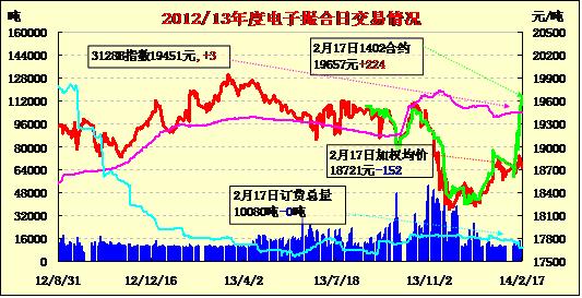2月17日,商品棉交易市場(chǎng)交易成交9000噸,較上一交易日減5360噸。訂貨量不變,累計(jì)訂貨10080噸。今日商品棉交易多數(shù)合同高開(kāi),日內(nèi)窄幅震蕩,均價(jià)多數(shù)上漲。成交主要集中在MA1406和MA1407合同,分別成交4000噸和4400噸,其余合同成交清冷。
