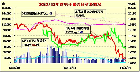 3月24日全國棉花交易市場商品棉交易成交13040噸,較上一交易日增2820噸。MA1403已經(jīng)了結(jié)下市,當前商品棉累計訂貨1280噸。今日商品棉各合同開盤高低不一,日內(nèi)窄幅整理,均價漲跌不一。有關(guān)部門決定自4月1日起,標準級競賣底價將由18000元/噸調(diào)整為17250元/噸;港口外棉人民幣報價相對持穩(wěn),美金報價近期有所上漲,整體來看,很少有成交。國際市場:印度國內(nèi)紡企需求一般,棉價相對持穩(wěn),目前收購已完成70%左右,近期巴基斯坦對印度棉進口需求相對不錯;巴基斯坦國內(nèi)棉市仍清淡,紗線銷售遲緩,紡企采購消極,大多軋花廠急于清庫存。