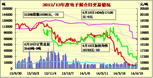 4月18日全國棉花交易市場商品棉交易成交10260噸,較上一交易日減少1320噸。訂貨量無增減,累計訂貨3540噸。今日商品棉交易各合同全線高開,日內(nèi)寬幅震動,均價漲跌互現(xiàn)。近月幾無成交,遠月MA1407合同、MA1408合同和MA1409合同分別成交4000噸、4240噸和2000噸。訂貨量無增減,當前訂貨重心在遠月,近月訂貨清冷。