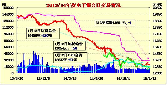 1月12日電子撮合交易成交11100噸,較上一交日增加980噸。訂貨量減少250噸,累計訂貨16450噸。交易各合同開盤高低不一,日內(nèi)震蕩下行,均價下跌。紗線總體行情可謂依舊弱字不改,整個市場反而更是冷清,和下落之勢為主。市場人士和紡紗廠家的看空心理不減,棉紡廠家?guī)齑媪坎粩嘣鲩L,相對急著出貨心里明顯,而市場商家卻是繼續(xù)觀望主導(dǎo),基本以銷定進。