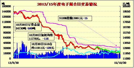 10月20日,電子撮合交易成交11980噸,較上一交易日減少3010噸。訂貨量減少580噸,累計(jì)訂貨24730噸。交易各合同多數(shù)低開,盤中震蕩走低,均價(jià)續(xù)跌。昨日,北疆石河子、奎屯、博樂等地3128級機(jī)采棉的站臺(tái)提貨價(jià)為11800-12000元/噸,3128級手采棉提貨價(jià)12500-12700元/噸,兵團(tuán)棉報(bào)價(jià)較地方高300-500元/噸。因疆內(nèi)皮棉很難成交,因此運(yùn)輸出疆成為各軋花廠、涉棉企業(yè)的唯一選擇,10月份以來申報(bào)鐵路運(yùn)輸計(jì)劃、公路運(yùn)輸?shù)钠っ迶?shù)量大幅上升。