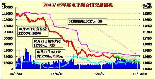 10月22日,電子撮合交易成交10480噸,較上一交易日減少2800噸。訂貨量減少200噸,累計(jì)訂貨22300噸。交易各合同多數(shù)高開(kāi),盤(pán)中窄幅震蕩,均價(jià)上漲。10月份以來(lái),因疆內(nèi)難以成交,棉花加工企業(yè)采取汽運(yùn)、鐵路運(yùn)輸?shù)确绞阶ゾo移庫(kù)至內(nèi)地棉花消費(fèi)區(qū),但銷(xiāo)售形勢(shì)仍然非常嚴(yán)峻,一方面大中型紡織廠對(duì)新棉品質(zhì)不放心,仍以采購(gòu)2014/15年度兵團(tuán)棉和保稅棉“過(guò)渡”為主,另一方面新疆棉企要求買(mǎi)家現(xiàn)款現(xiàn)貨,不賒欠。近幾日的天氣因素對(duì)市場(chǎng)交售進(jìn)度的影響令價(jià)格有所持穩(wěn)。