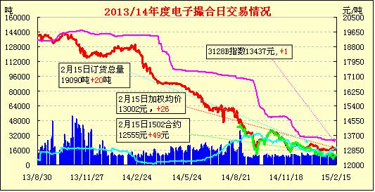 2月15日電子撮合交易成交10210噸,較上一交日減少60噸。訂貨量增加20噸,累計訂貨19090噸。交易各合同多數(shù)高開,日內(nèi)震蕩整理,均價漲跌互現(xiàn)。各企業(yè)陸續(xù)放假,交投基本停滯。從現(xiàn)貨價格來看,疆棉報價仍維持高位,內(nèi)地報價持穩(wěn)。