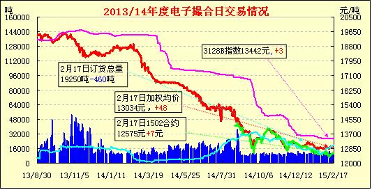 2月17日電子撮合交易成交10580噸,較上一交日增加2610噸。訂貨量減少460噸,累計(jì)訂貨19250噸。交易各合同日內(nèi)震蕩整理,各個(gè)合同有增有減。據(jù)Cotlook(考特魯克),周一國(guó)際現(xiàn)貨報(bào)價(jià)繼續(xù)上漲,由于美國(guó)“總統(tǒng)日”放假,美棉詢價(jià)減少針對(duì)其他現(xiàn)貨的詢價(jià)主要有西非棉和巴西棉,孟加拉成交少量中亞棉。土耳其紡企財(cái)政危機(jī)依然沒有消除,未來可能面對(duì)更多取消簽約。