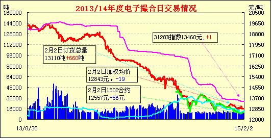 2月2日11電子撮合交易成交10050噸,較上一交日減少170噸。訂貨量增加210噸,累計(jì)訂貨12450噸。交易各合同開盤高低不一,日內(nèi)震蕩下行,均價漲跌不一。據(jù)反映冀魯豫少數(shù)情況好一點(diǎn)的紡企還在生產(chǎn)前期的訂單,情況中等的已經(jīng)安排在2月10日左右放假了,小型企業(yè)現(xiàn)在已經(jīng)陸續(xù)放假了;當(dāng)前內(nèi)地庫3128、2128級南疆手采棉報(bào)價14000-14200元/噸、14200-14500元/噸,實(shí)際成交價略低100-150元/噸,但由于中小棉紡織廠陸續(xù)放假、企業(yè)資金流緊張等原因,新疆棉現(xiàn)貨春節(jié)前成交基本停滯。