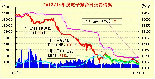 3月30日電子撮合交易成交16040噸,較上一交易日增加5020噸。訂貨量增加50噸,累計(jì)訂貨18370噸。交易各合同多數(shù)高開,盤中高位整固,均價(jià)小幅上漲。